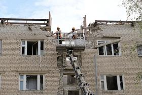 Последствия обстрела многоквартирного дома в Буденовском районе. Эвакуация человека из окна…
