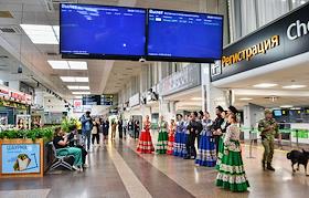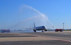Церемония открытия первого рейса после возобновления воздушного сообщения в аэропорту города…