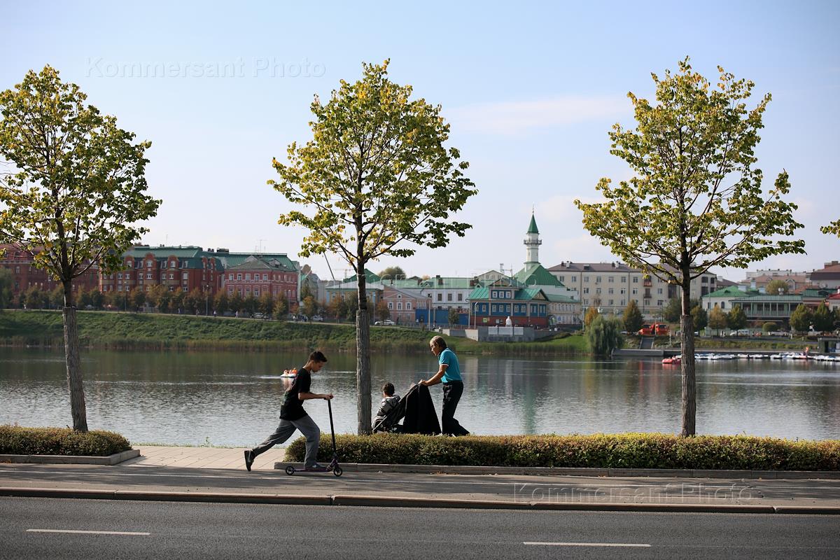 Виды Казани. Жанровая фотография. Строительство нового жилого района на берегу реки.
