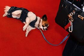 Жанровая фотография. Собака лежит на красной дорожке.