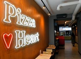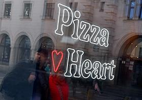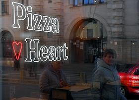 Виды Санкт-Петербурга. Жанровая фотография. Вывеска в витрине пиццерии сети компании Pizza Heart.