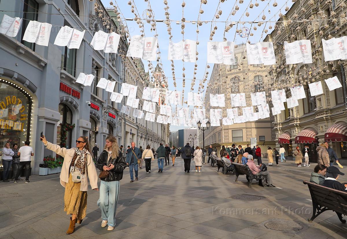 Жанровые фотографии. Инсталляция из тетрадных листов ко Дню учителя на Никольской улице.