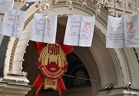 Жанровая фотография. Инсталляция из тетрадных листов ко Дню учителя на здании ГУМа.
