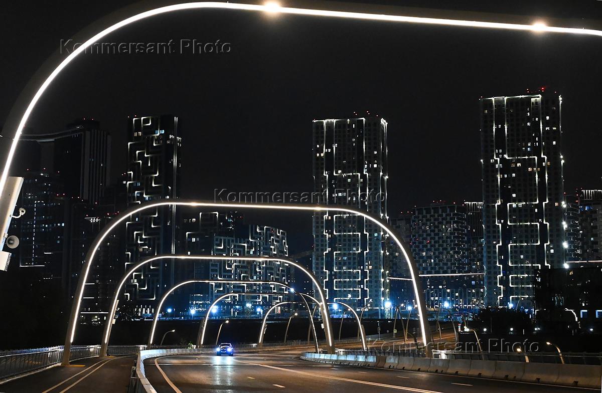 Виды Москвы. Жанровая фотография. Новый мост через реку Раменку на улице Мосфильмовская с арочной…