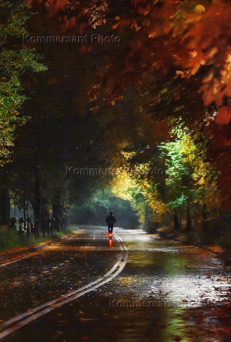 Виды вечерней Москвы. Туман на Воробьевых горах. Жанровая фотография. Сотрудник кикшеринга "МТС…