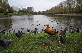 Виды Москвы. Жанровая фотография. Утки и голуби на берегу Мазиловского пруда возле станции метро…
