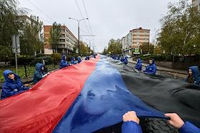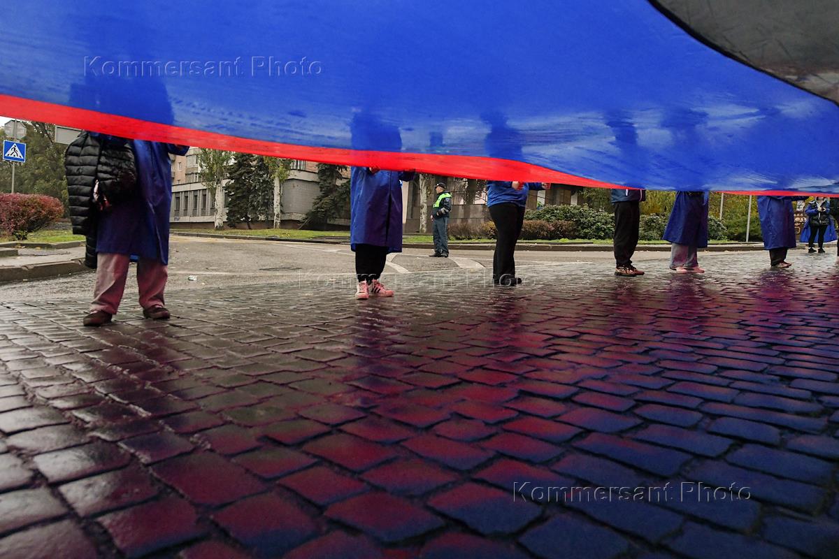 День флага Донецкой Народной Республики. Активисты развернули 200-метровый флаг ДНР в центре города.
