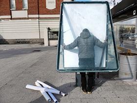 Жанровая фотография. Сотрудник службы обслуживания рекламных конструкций во время смены плаката.
