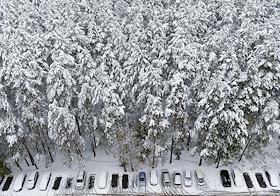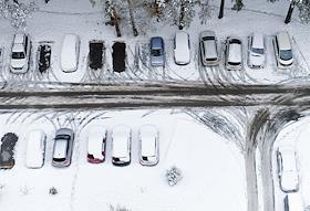 Виды Новосибирска после снегопада. Жанровая фотография. Автомобили на парковке во дворе жилого дома.