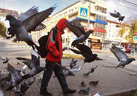 Виды Новосибирска. Красный проспект. Жанровая фотография. Голуби на бульваре.