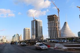Виды Астаны. Жанровая фотография. Строящиеся жилые дома на фоне торгово-развлекательного центра "Хан…