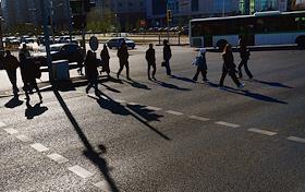 Виды Астаны. Жанровая фотография. Пешеходы во время перехода улицы по наземному пешеходному переходу.