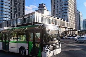 Виды Астаны. Жанровая фотография. Пассажирский автобус на фоне здания торгового центра Talan Gallery.