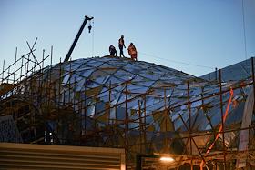 Виды Астаны. Жанровая фотография. Рабочие во время монтажа стеклянного купола здания.
