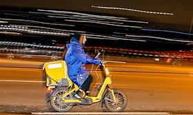 Виды Санкт-Петербурга. Жанровая фотография. Курьер сервиса "Яндекс Еда" на Октябрьской набережной.