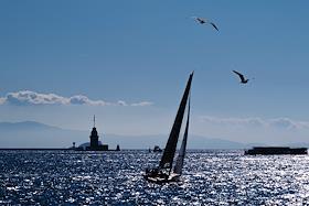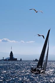 Виды Стамбула. Жанровая фотография. Парусная яхта и Девичья башня в проливе Босфор.