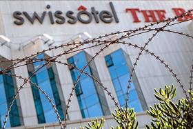 Виды Стамбула. Жанровая фотография. Здание Swissotel The Bosphorus за забором из колючей проволоки.