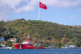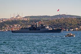 Виды Стамбула. Жанровая фотография. Военный корабль в проливе Босфор.