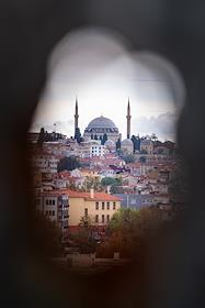 Виды Стамбула. Жанровая фотография. Вид на мечеть через дыру в металлическом заборе.
