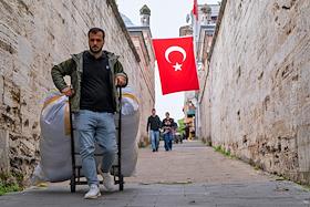 Виды Стамбула. Жанровая фотография. Мужчина тащит тележку по городской улице.