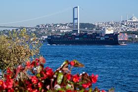Виды Стамбула. Жанровая фотография. Контейнеровоз идет по проливу Босфор.