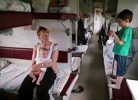 Пассажиры в плацкартном вагоне поезда Транссибирской железнодорожной магистрали (Транссиб).