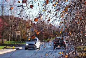 Золотая осень в посёлке Новая Ижора. Жанровая фотография. Ветви березы на фоне автодороги.
