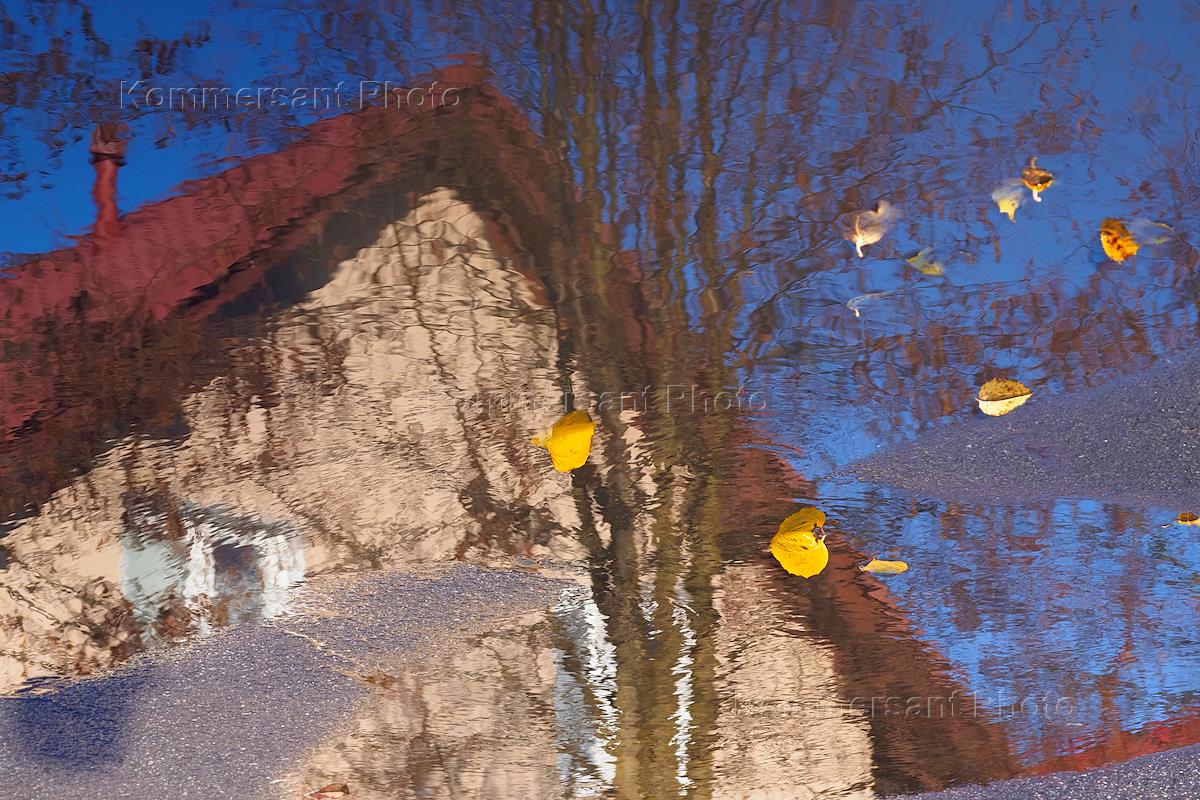 Золотая осень в посёлке Новая Ижора. Жанровая фотография. Отражение дома в реке, желтые осенник…