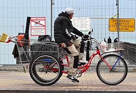 Виды Сочи. Жанровая фотография. Мужчина с приспособлениями для уличной уборки на велосипеде едет по…