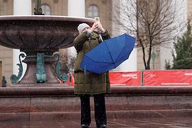 Жанровая фотография. Женщина с зонтом фотографируется у фонтана на площади у здания Государственного…