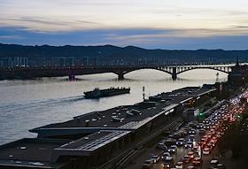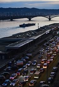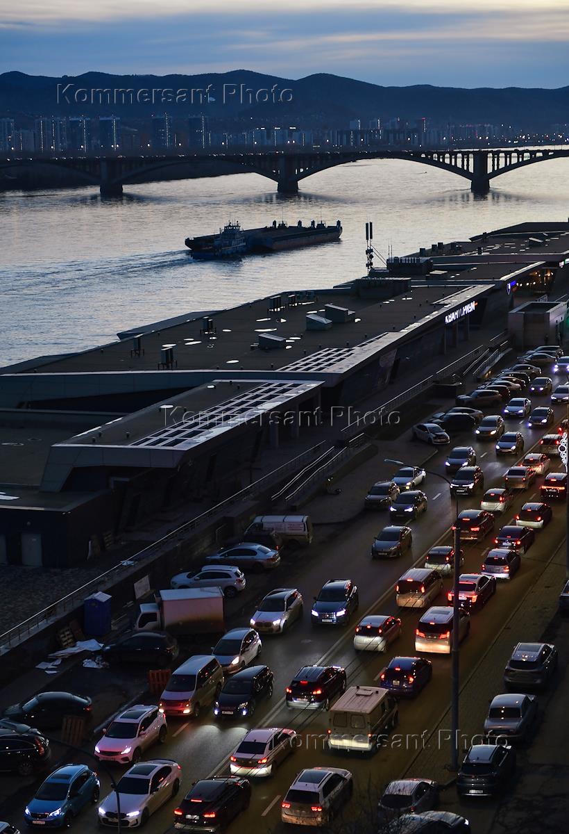 Жанровая фотография. Виды Красноярска. Дорожные автомобильные пробки на набережной реки Енисей.…