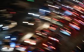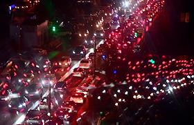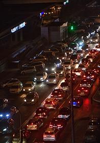 Жанровая фотография. Виды Красноярска. Дорожные автомобильные пробки на трассе города вечером.