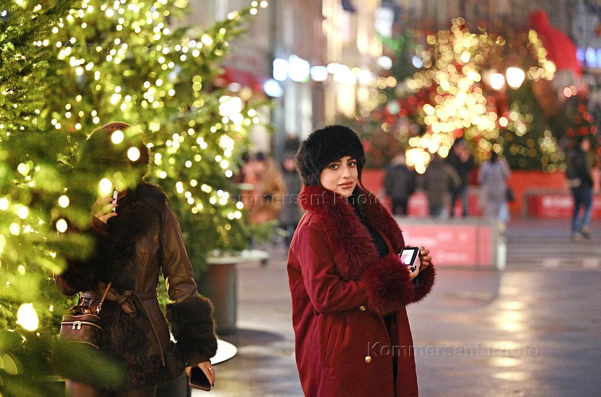 Виды Москвы. Жанровая фотография. Подготовка к празднованию Нового года в городе. Девушка делает…