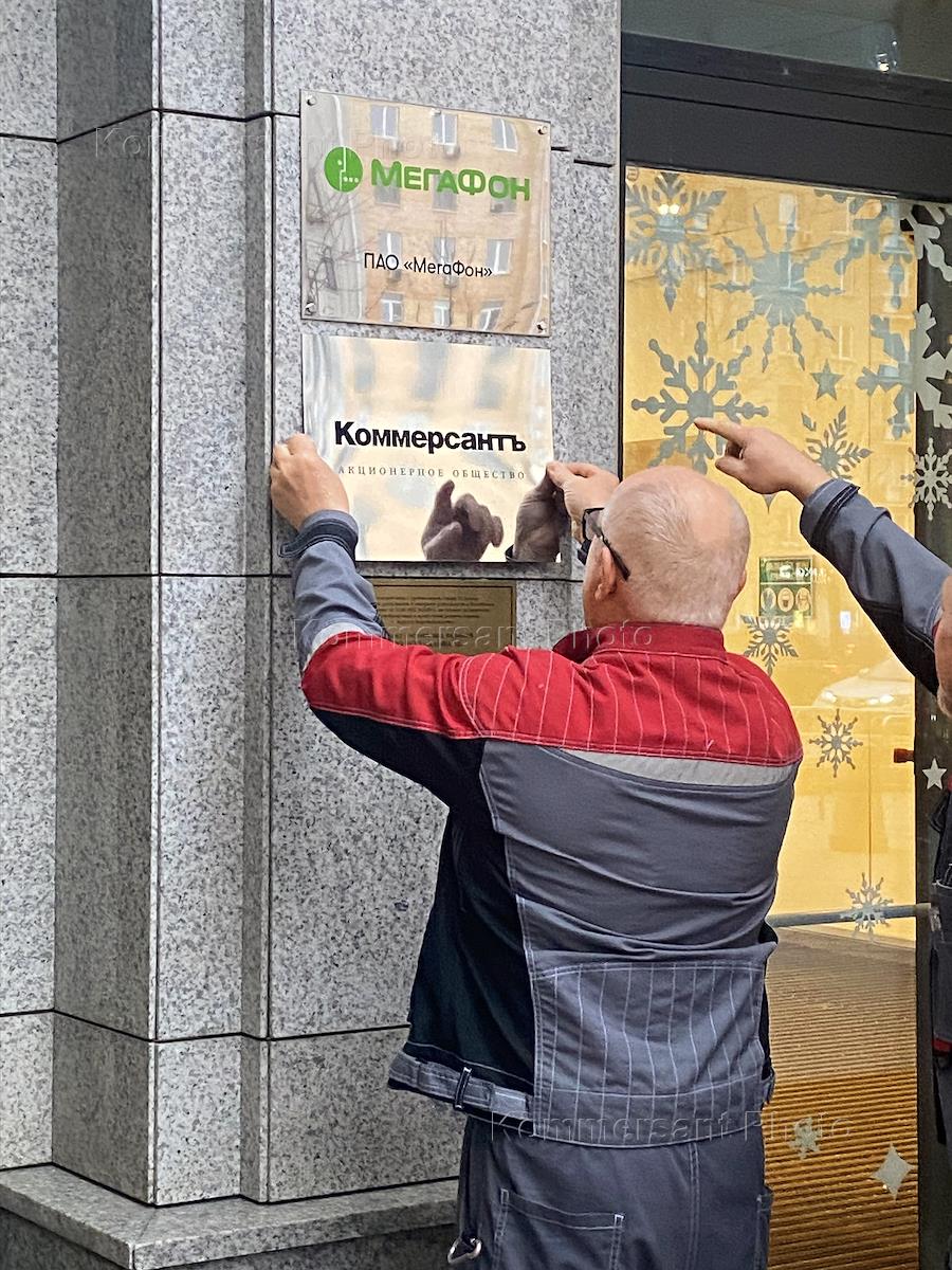 Жанровая фотография. Установка таблички АО "Коммерсантъ" на входе в здание бизнес-центра "Оружейный".