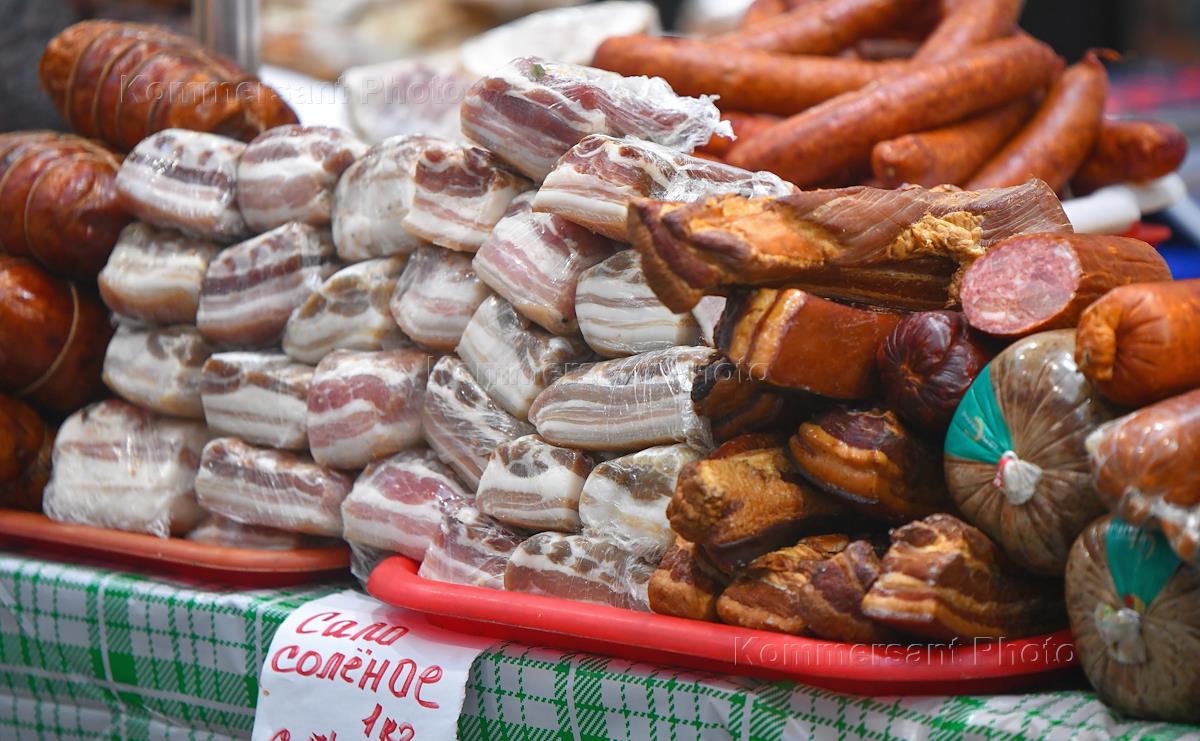 Краевая ярмарка свежих продуктов в МВДЦ "Сибирь". Жанровая фотография. Домашнее сало и колбасные…