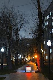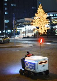 Жанровая фотография. Подготовка к празднованию Нового года в городе. Робот-доставщик компании…