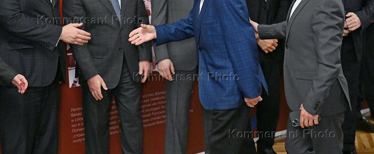 Церемония открытия выставки "130-летие российского бокса" в Государственной думе (ГД) России. Слева…