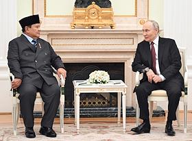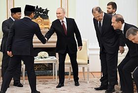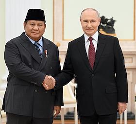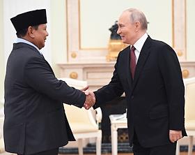 Президент России Владимир Путин (справа) и президент Индонезии Прабово Субианто (слева) во время…