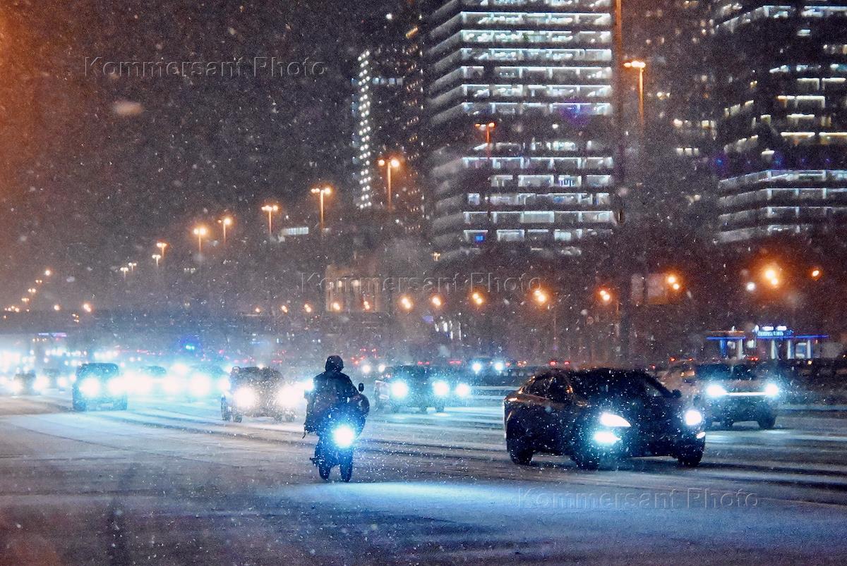 Жанровая фотография. Метель в городе. Автомобили на дороге.