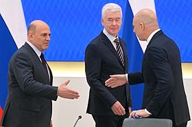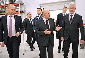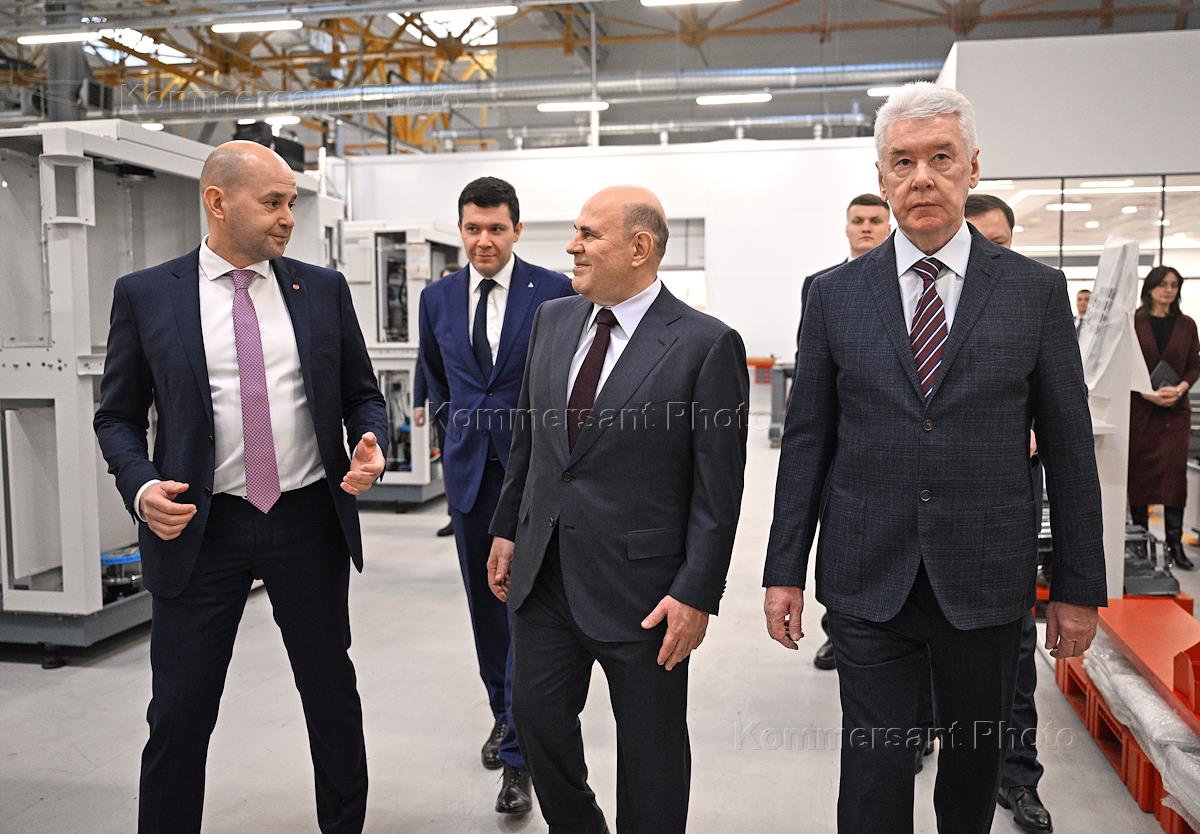 Председатель правительства России Михаил Мишустин (в центре) и мэр Москвы Сергей Собянин (справа) во…