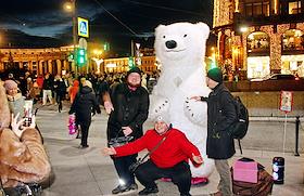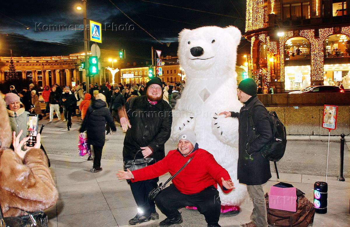 Виды Санкт-Петербурга. Жанровая фотография. Аниматор в ростовой кукле белого медведя у выхода из…