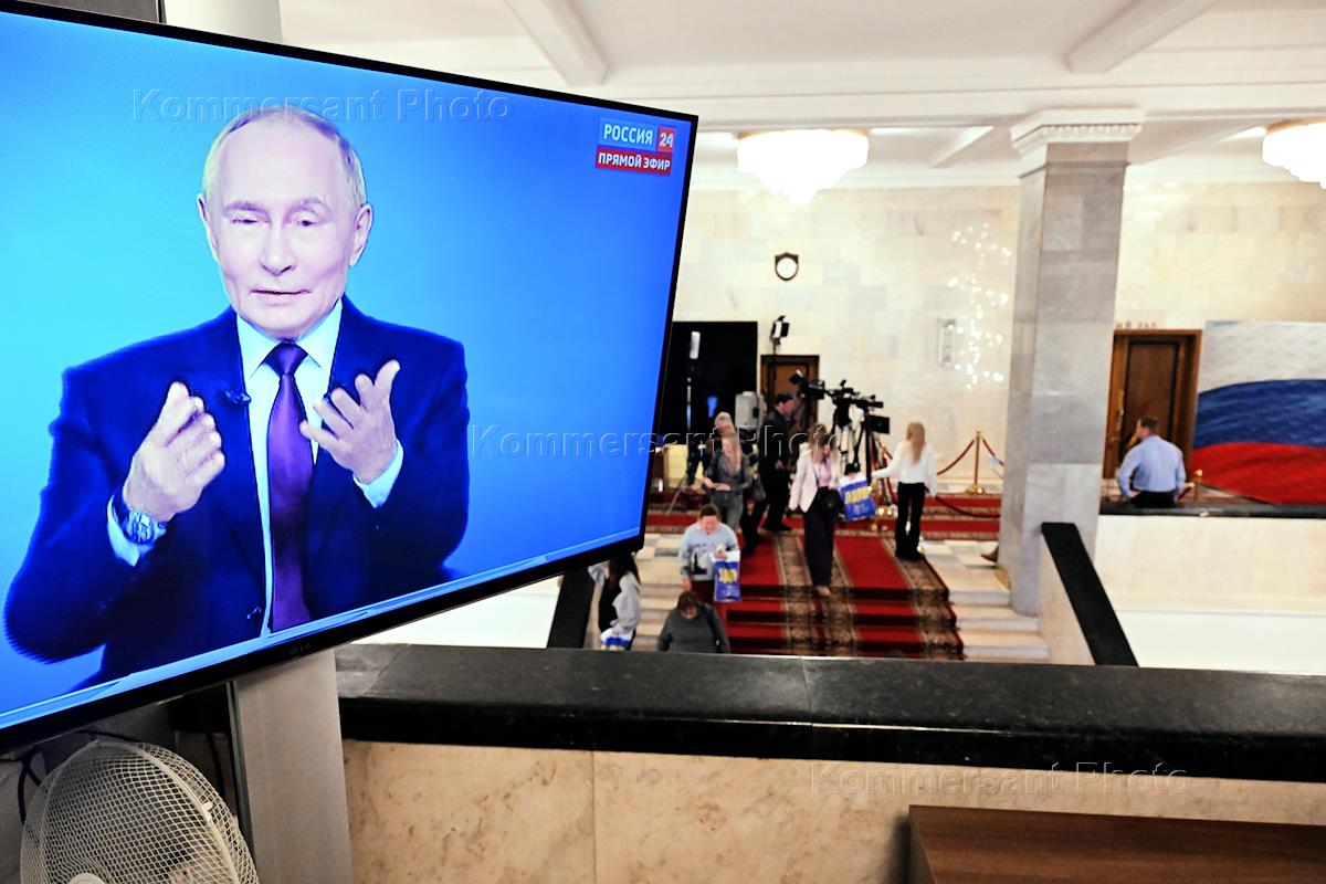 Трансляция программы "Итоги года с Владимиром Путиным" на экране телевизора в Государственной думе…
