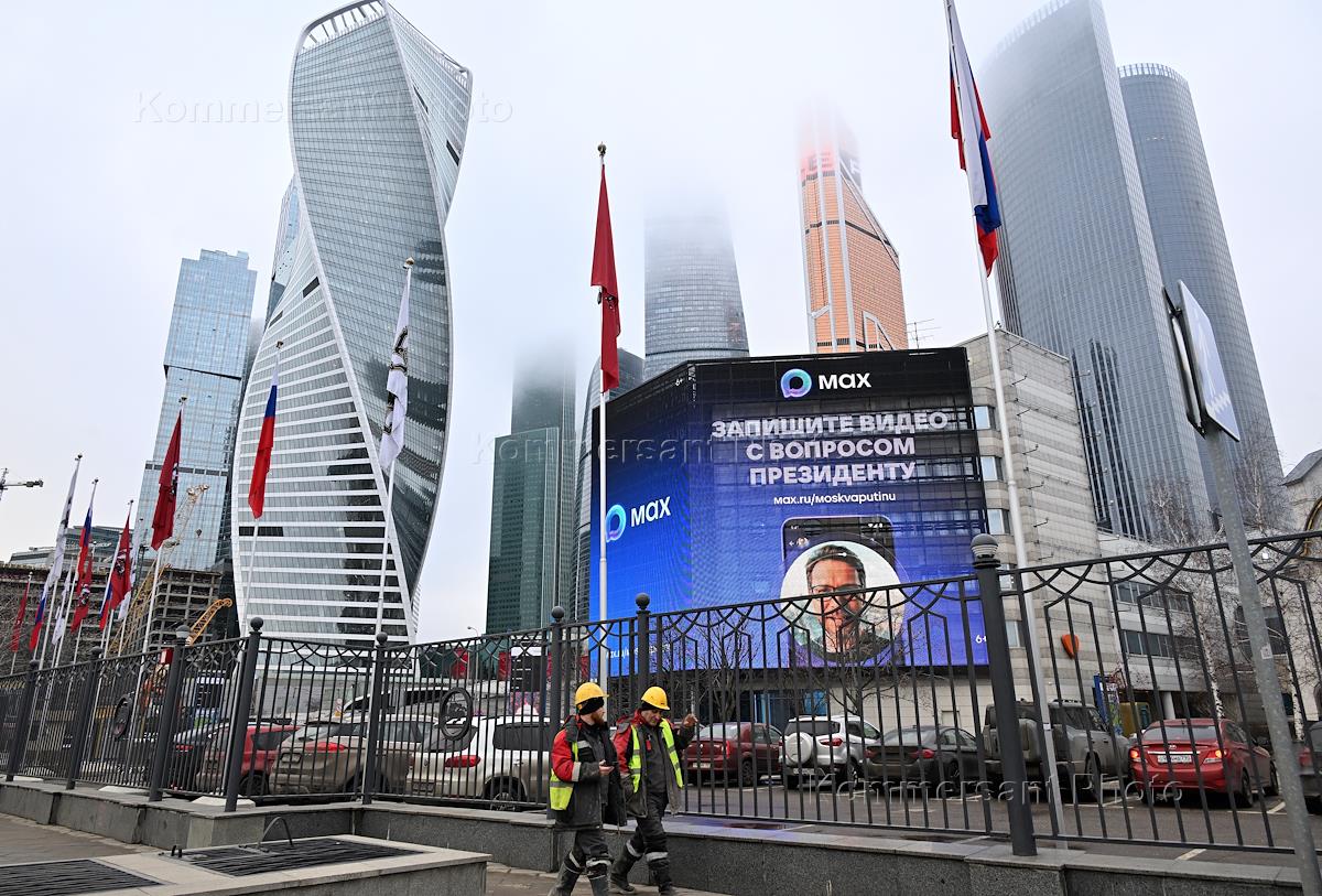 Жанровая фотография. На экранах трансляция пресс-конференции и прямой линии "Итоги года 2025" с президентом России Владимиром Путиным.