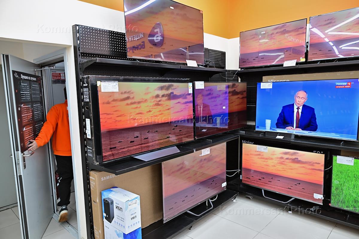 Прямая трансляция программы "Итоги года с Владимиром Путиным" на экране телевизора в магазине…