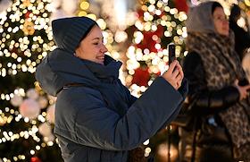 Виды Москвы. Новогоднее украшение города. Жанровая фотография. Женщина фотографируют новогоднюю…