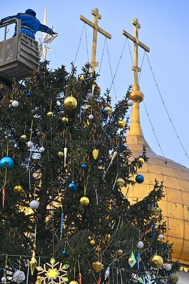 Украшение главной новогодней ели России на Соборной площади Московского Кремля.