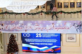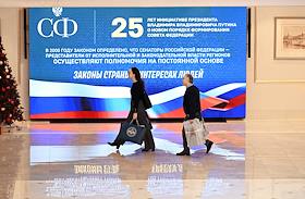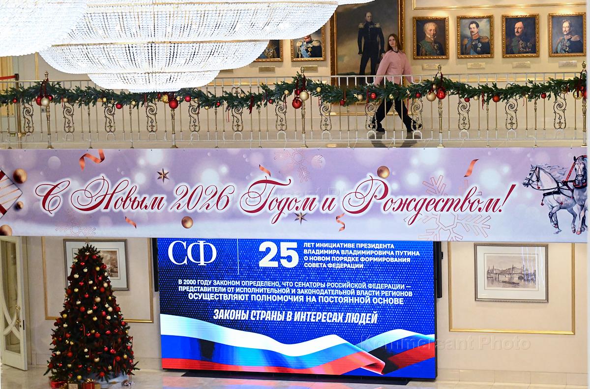 Пленарное заседание Совета Федерации России. Жанровая фотография. Электронное табло в холле здания…