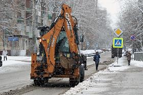 Жанровая фотография. Снегопад в городе. Трактор с ковшом коммунальных служб города во время уборки…