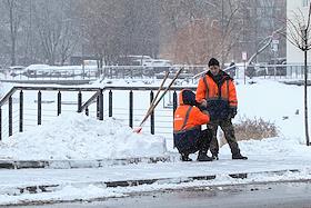 Жанровая фотография. Снегопад в городе. Сотрудники коммунальной службы города во время уборки снега.