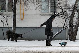 Жанровая фотография. Снегопад в городе. Мужчина во время прогулки с собаками у дома.